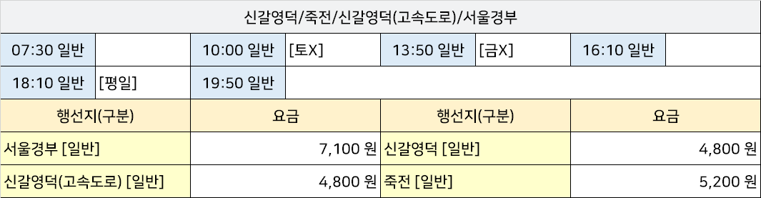천안3공단시외고속버스터미널 천안3공단정류장 천안3공단정류소 → "서울경부,신갈영덕(고속도로),죽전".