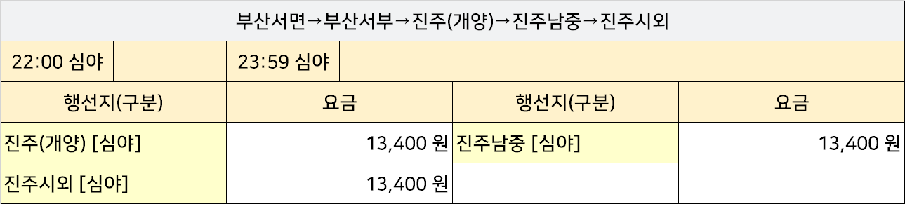 부산역심야시외고속버스터미널 부산역심야버스정류장 부산역심야버스정류소 → "부산서면→부산서부→진주(개양)→진주남중→진주시외".