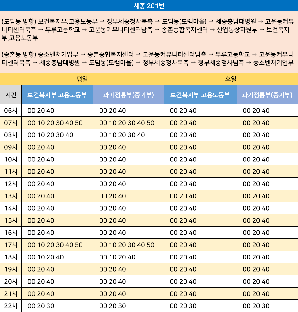 세종 201번: (도담동 방향) 보건복지부.고용노동부 → 정부세종청사북측 → 도담동(도램마을) → 세종충남대병원 → 고운동커뮤니티센터북측 → 두루고등학교 → 고운동커뮤니티센터남측 → 종촌종합복지센터 → 산업통상자원부 → 보건복지부.고용노동부 / (종촌동 방향) 중소벤처기업부 → 종촌종합복지센터 → 고운동커뮤니티센터남측 → 두루고등학교 → 고운동커뮤니티센터북측 → 세종충남대병원 → 도담동(도램마을) → 정부세종청사북측 → 정부세종청사남측 → 중소벤처기업부