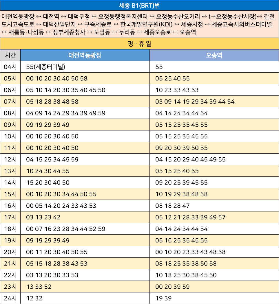 세종 B1(BRT)번: 대전역동광장 ↔ 대전역 ↔ 대덕구청 ↔ 오정동행정복지센터 ↔ 오정농수산오거리 ↔ (→오정농수산시장)↔ 갑천도시고속도로 ↔ 대덕산업단지 ↔ 구즉세종로 ↔ 한국개발연구원(KDI) ↔ 세종시청 ↔ 세종고속시외버스터미널 ↔ 새롬동·나성동 ↔ 정부세종청사 ↔ 도담동 ↔ 누리동 ↔ 세종오송로 ↔ 오송역
