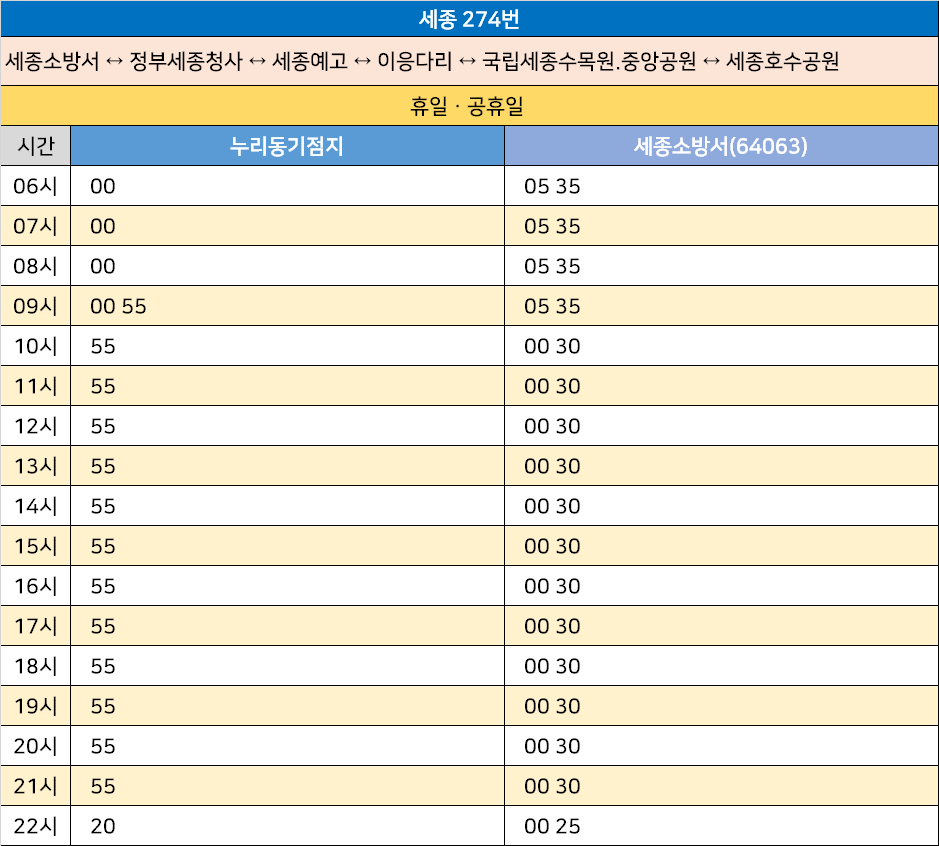 세종 274번: 세종소방서 ↔ 정부세종청사 ↔ 세종예고 ↔ 이응다리 ↔ 국립세종수목원.중앙공원 ↔ 세종호수공원