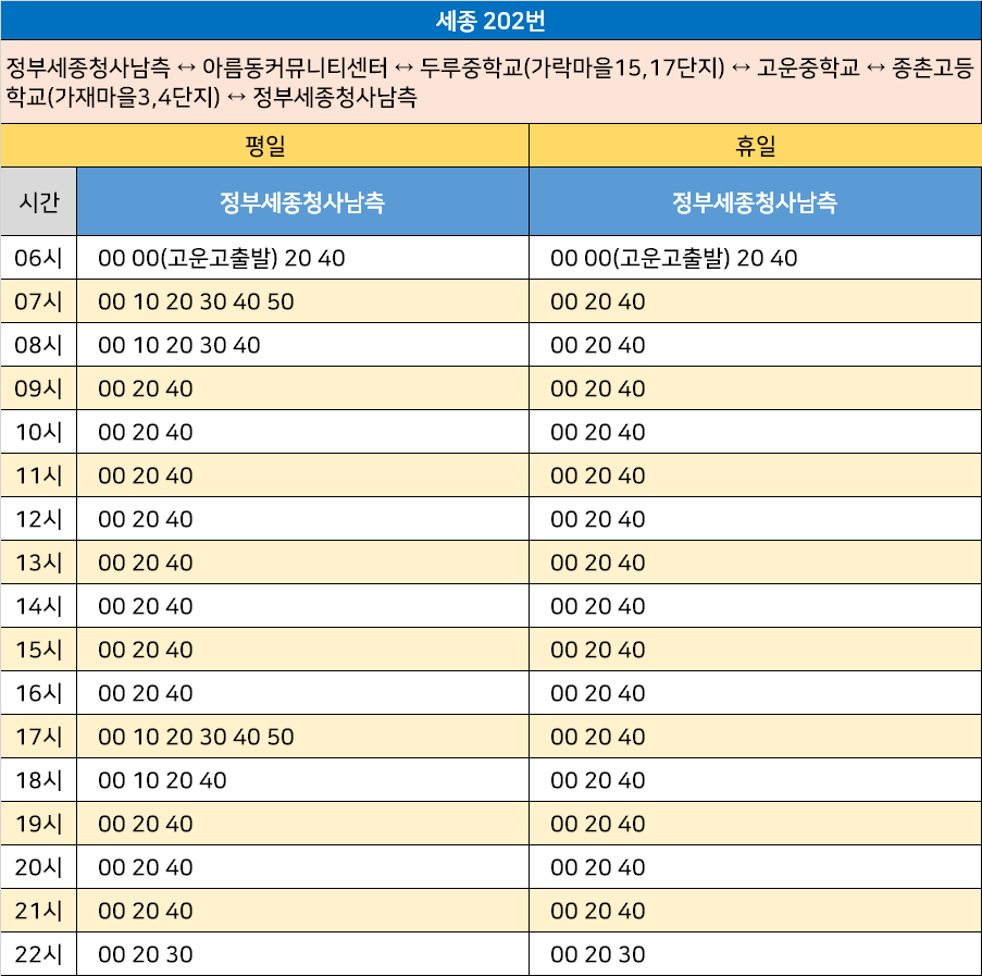 세종 202번: 정부세종청사남측 ↔ 아름동커뮤니티센터 ↔ 두루중학교(가락마을15,17단지) ↔ 고운중학교 ↔ 종촌고등학교(가재마을3,4단지) ↔ 정부세종청사남측