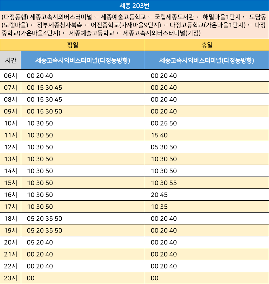 세종 203번: (다정동행) 세종고속시외버스터미널 ← 세종예술고등학교 ← 국립세종도서관 ← 해밀마을1단지 ← 도담동(도램마을) ← 정부세종청사북측 ← 어진중학교(가재마을9단지) ← 다정고등학교(가온마을1단지) ← 다정중학교(가온마을4단지) ← 세종예술고등학교 ← 세종고속시외버스터미널(기점)
