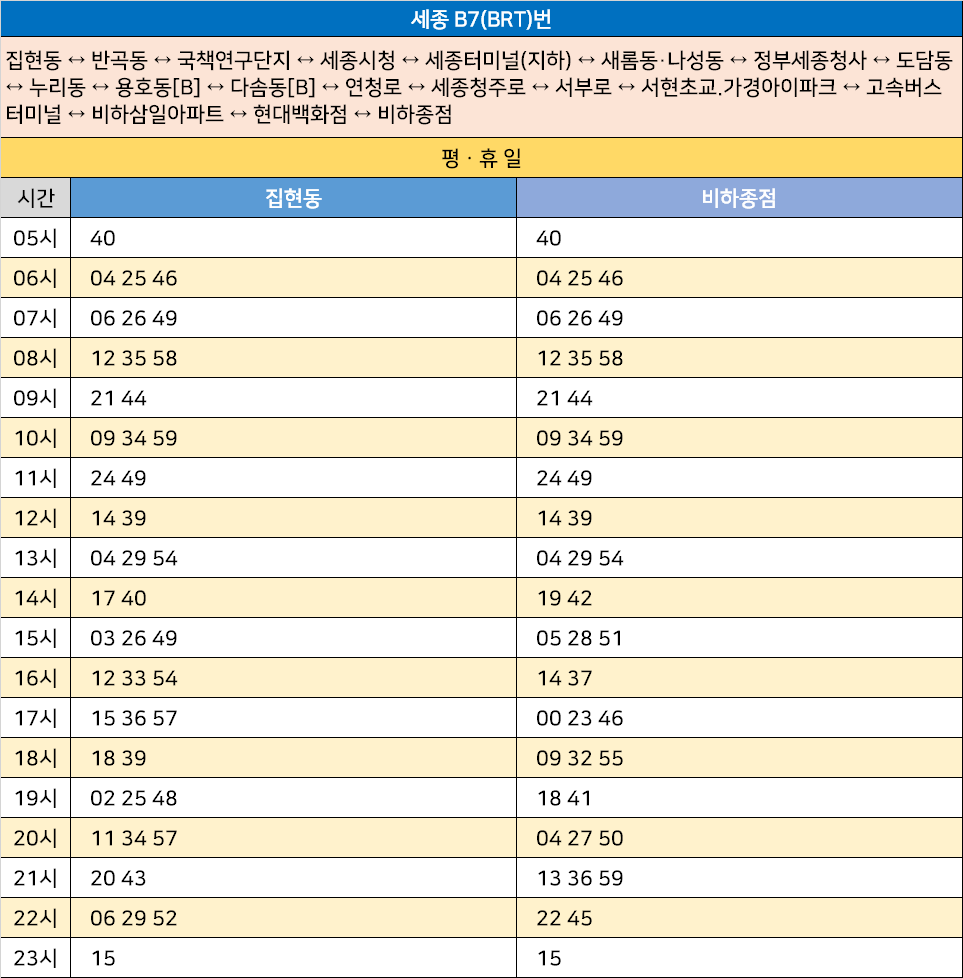 세종 B7(BRT)번: 집현동 ↔ 반곡동 ↔ 국책연구단지 ↔ 세종시청 ↔ 세종터미널(지하) ↔ 새롬동·나성동 ↔ 정부세종청사 ↔ 도담동 ↔ 누리동 ↔ 용호동[B] ↔ 다솜동[B] ↔ 연청로 ↔ 세종청주로 ↔ 서부로 ↔ 서현초교.가경아이파크 ↔ 고속버스터미널 ↔ 비하삼일아파트 ↔ 현대백화점 ↔ 비하종점