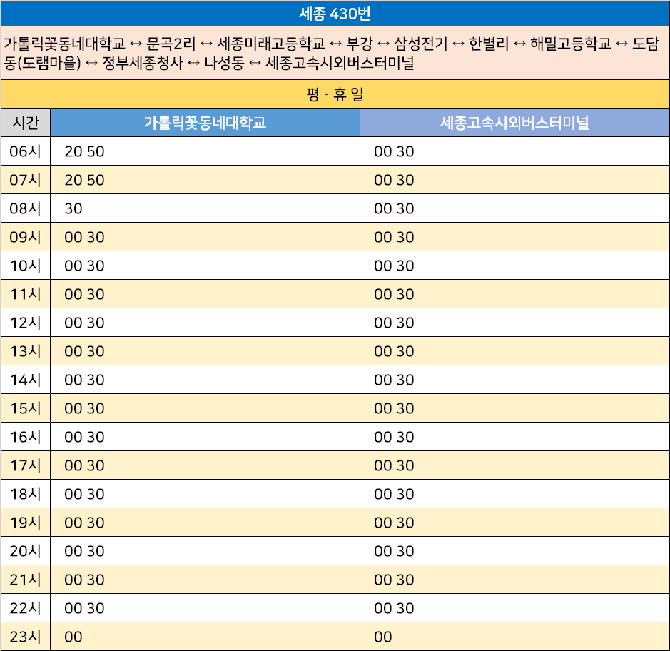 세종 430번: 가톨릭꽃동네대학교 ↔ 문곡2리 ↔ 세종미래고등학교 ↔ 부강 ↔ 삼성전기 ↔ 한별리 ↔ 해밀고등학교 ↔ 도담동(도램마을) ↔ 정부세종청사 ↔ 나성동 ↔ 세종고속시외버스터미널
