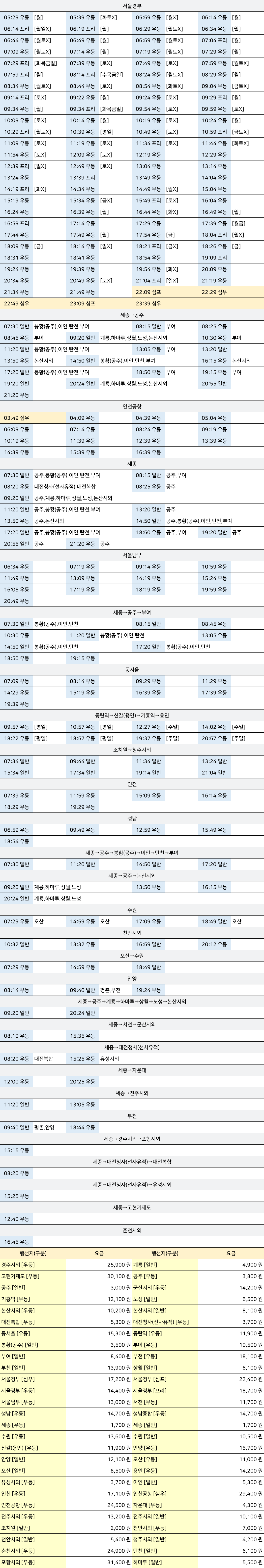 정부세종청사 시외버스 정류장 시간표/요금표 2025년 04월 01일 기준