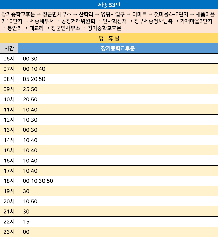 세종 53번: 장기중학교후문 → 장군면사무소 → 산학리 → 영평사입구 → 이마트 → 첫마을4~6단지 → 새뜸마을7.10단지 → 세종세무서 → 공정거래위원회 → 인사혁신처 → 정부세종청사남측 → 가재마을2단지 → 봉안리 → 대교리 → 장군면사무소 → 장기중학교후문