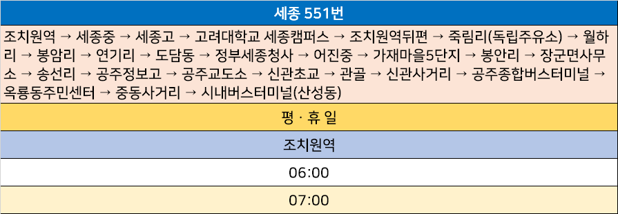 세종 551번: 조치원역 → 세종중 → 세종고 → 고려대학교 세종캠퍼스 → 조치원역뒤편 → 죽림리(독립주유소) → 월하리 → 봉암리 → 연기리 → 도담동 → 정부세종청사 → 어진중 → 가재마을5단지 → 봉안리 → 장군면사무소 → 송선리 → 공주정보고 → 공주교도소 → 신관초교 → 관골 → 신관사거리 → 공주종합버스터미널 → 옥룡동주민센터 → 중동사거리 → 시내버스터미널(산성동)