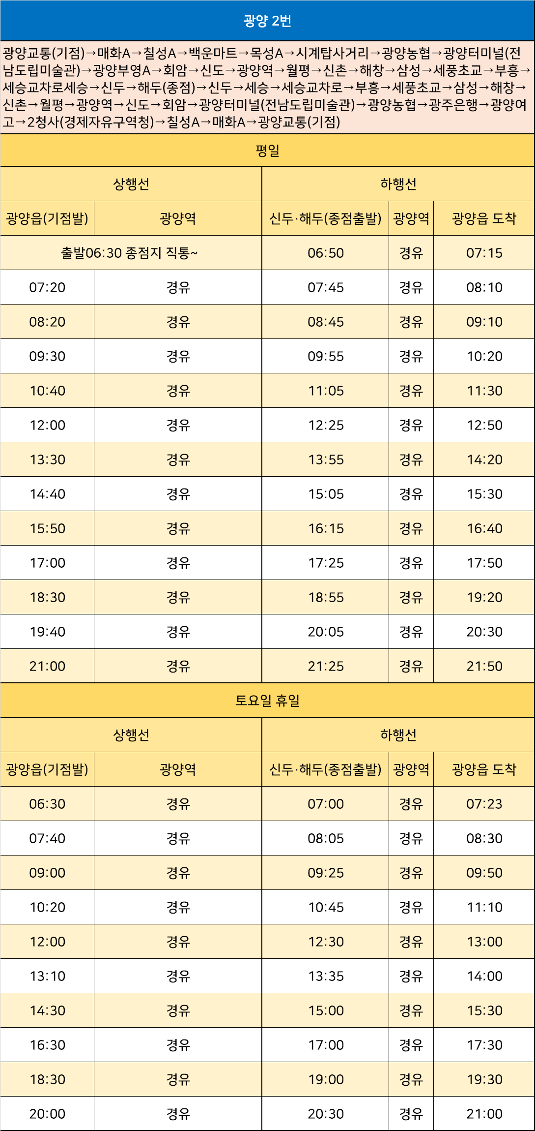 광양 2번: 광양교통(기점)→매화A→칠성A→백운마트→목성A→시계탑사거리→광양농협→광양터미널(전남도립미술관)→광양부영A→회암→신도→광양역→월평→신촌→해창→삼성→세풍초교→부흥→세승교차로세승→신두→해두(종점)→신두→세승→세승교차로→부흥→세풍초교→삼성→해창→신촌→월평→광양역→신도→회암→광양터미널(전남도립미술관)→광양농협→광주은행→광양여고→2청사(경제자유구역청)→칠성A→매화A→광양교통(기점)