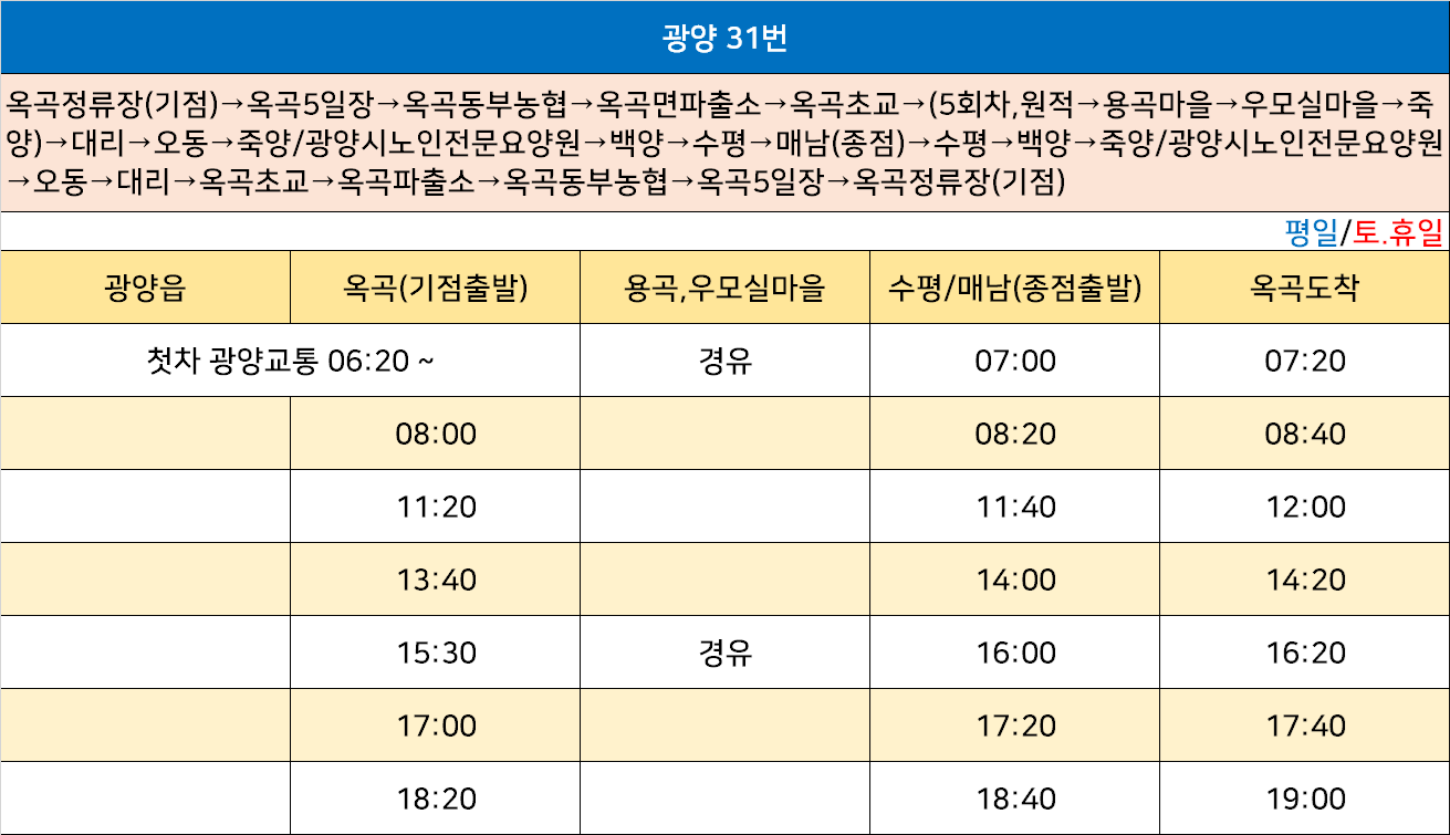 광양 31번: 옥곡정류장(기점)→옥곡5일장→옥곡동부농협→옥곡면파출소→옥곡초교→(5회차,원적→용곡마을→우모실마을→죽양)→대리→오동→죽양/광양시노인전문요양원→백양→수평→매남(종점)→수평→백양→죽양/광양시노인전문요양원→오동→대리→옥곡초교→옥곡파출소→옥곡동부농협→옥곡5일장→옥곡정류장(기점)