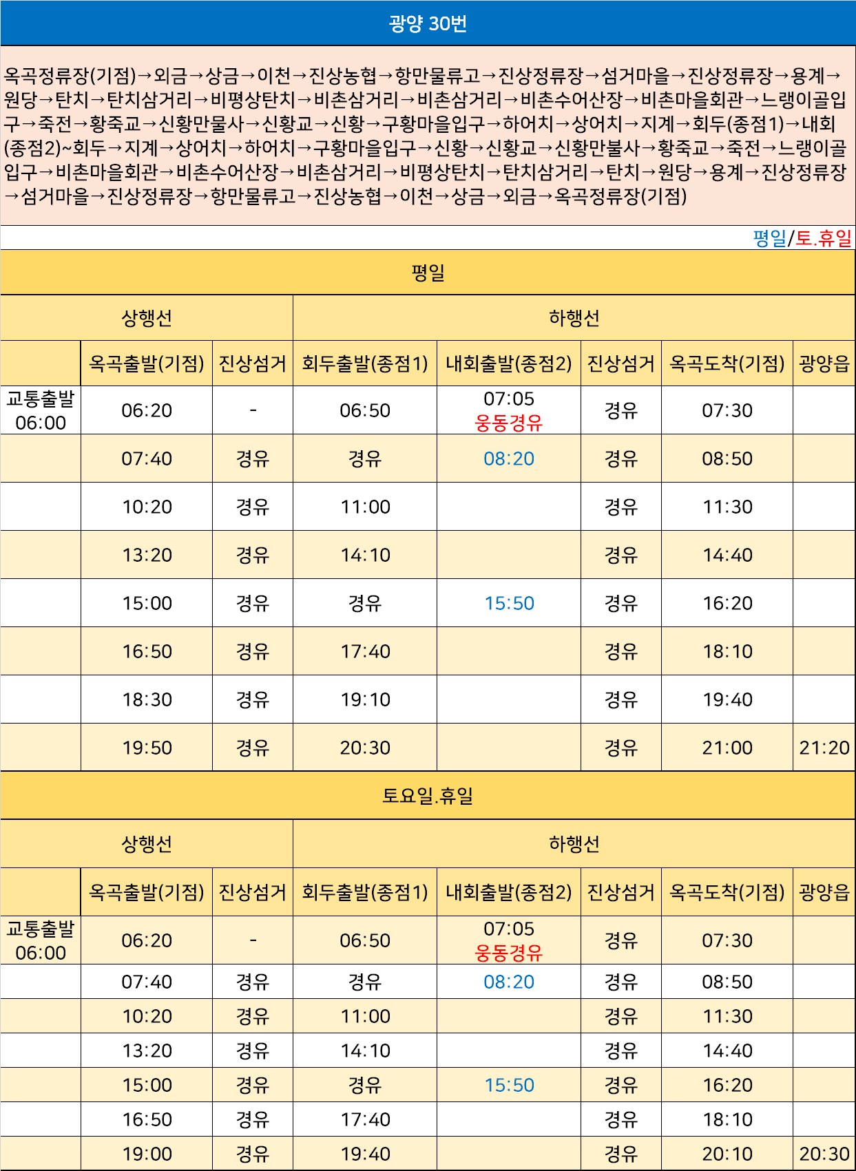 광양 30번: 옥곡정류장(기점)→외금→상금→이천→진상농협→항만물류고→진상정류장→섬거마을→진상정류장→용계→원당→탄치→탄치삼거리→비평상탄치→비촌삼거리→비촌삼거리→비촌수어산장→비촌마을회관→느랭이골입구→죽전→황죽교→신황만물사→신황교→신황→구황마을입구→하어치→상어치→지계→회두(종점1)→내회(종점2)~회두→지계→상어치→하어치→구황마을입구→신황→신황교→신황만불사→황죽교→죽전→느랭이골입구→비촌마을회관→비촌수어산장→비촌삼거리→비평상탄치→탄치삼거리→탄치→원당→용계→진상정류장→섬거마을→진상정류장→항만물류고→진상농협→이천→상금→외금→옥곡정류장(기점)