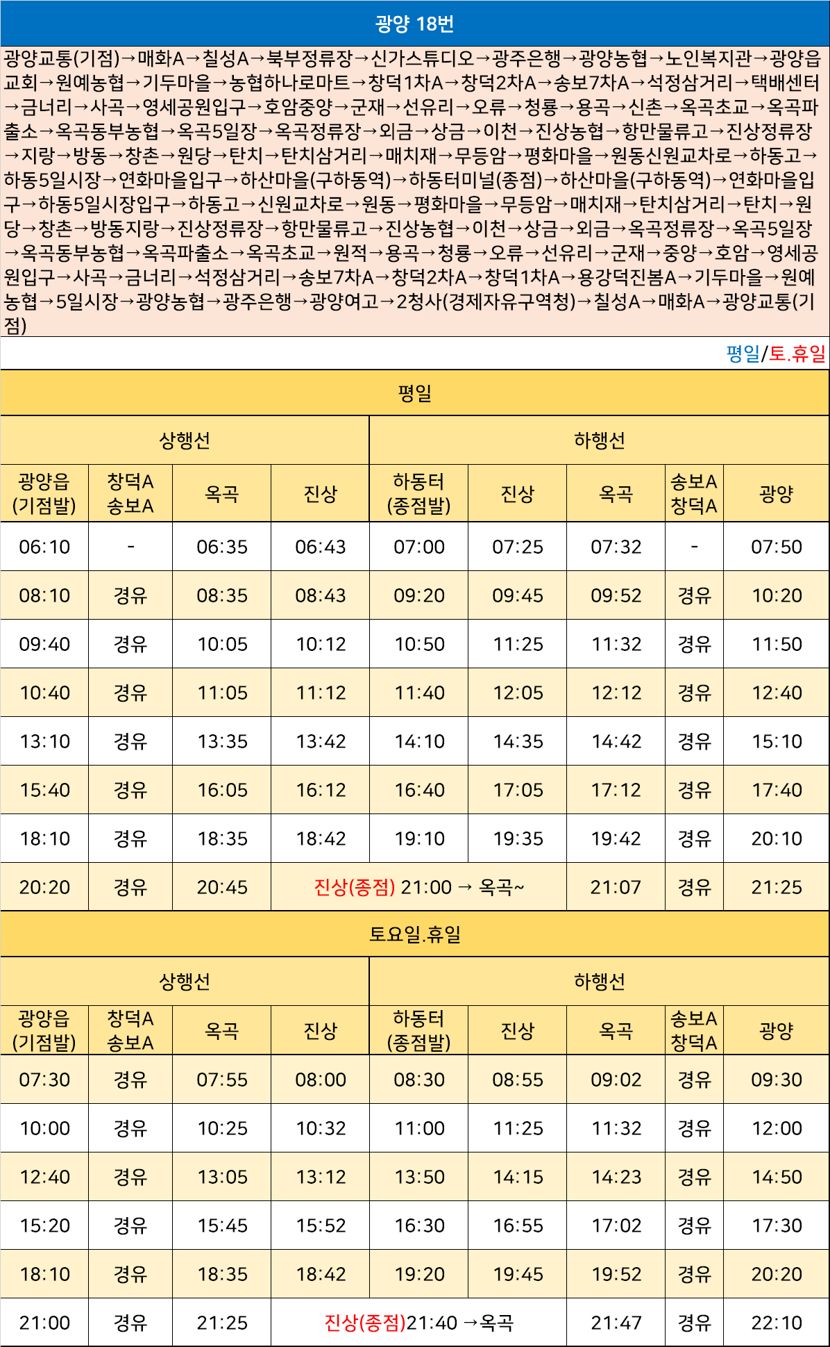 광양 18번: 광양교통(기점)→매화A→칠성A→북부정류장→신가스튜디오→광주은행→광양농협→노인복지관→광양읍교회→원예농협→기두마을→농협하나로마트→창덕1차A→창덕2차A→송보7차A→석정삼거리→택배센터→금너리→사곡→영세공원입구→호암중양→군재→선유리→오류→청룡→용곡→신촌→옥곡초교→옥곡파출소→옥곡동부농협→옥곡5일장→옥곡정류장→외금→상금→이천→진상농협→항만물류고→진상정류장→지랑→방동→창촌→원당→탄치→탄치삼거리→매치재→무등암→평화마을→원동신원교차로→하동고→하동5일시장→연화마을입구→하산마을(구하동역)→하동터미널(종점)→하산마을(구하동역)→연화마을입구→하동5일시장입구→하동고→신원교차로→원동→평화마을→무등암→매치재→탄치삼거리→탄치→원당→창촌→방동지랑→진상정류장→항만물류고→진상농협→이천→상금→외금→옥곡정류장→옥곡5일장→옥곡동부농협→옥곡파출소→옥곡초교→원적→용곡→청룡→오류→선유리→군재→중양→호암→영세공원입구→사곡→금너리→석정삼거리→송보7차A→창덕2차A→창덕1차A→용강덕진봄A→기두마을→원예농협→5일시장→광양농협→광주은행→광양여고→2청사(경제자유구역청)→칠성A→매화A→광양교통(기점)