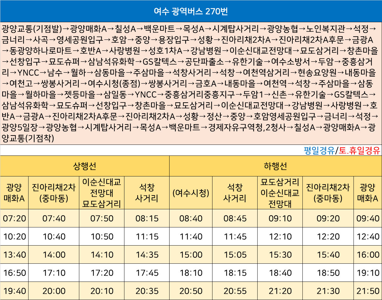 여수 광역버스 270번: 광양교통(기점발)→광양매화A→칠성A→백운마트→목성A→시계탑사거리→광양농협→노인복지관→석정→금너리→사곡→영세공원입구→호암→중양→용장입구→성황→진아리채2차A→진아리채2차A후문→금광A→동광양하나로마트→호반A→사랑병원→성호1차A→강남병원→이순신대교전망대→묘도삼거리→창촌마을→선창입구→묘도슈퍼→삼남석유화학→GS칼텍스→공단파출소→유한기술→여수소방서→두암→중흥삼거리→YNCC→남수→월하→삼동마을→주삼마을→석창사거리→석창→여천역삼거리→현송요양원→내동마을→여천고→쌍봉사거리→여수시청(종점)→쌍봉사거리→금호A→내동마을→여천역→석창→주삼마을→삼동마을→월하마을→젯등마을→삼일동→YNCC→중흥삼거리중흥지구→두암1→신촌→유한기술→GS칼텍스→삼남석유화학→묘도슈퍼→선창입구→창촌마을→묘도삼거리→이순신대교전망대→강남병원→사랑병원→호반A→금광A→진아리채2차A후문→진아리채2차A→성황→정산→중양→호암영세공원입구→금너리→석정→광양5일장→광양농협→시계탑사거리→목성A→백운마트→경제자유구역청,2청사→칠성A→광양매화A→광양교통(기점착)