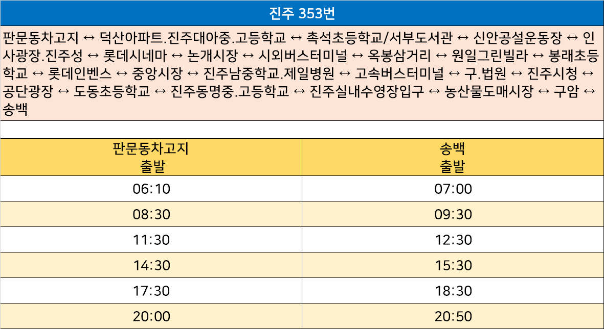 진주 353번: 판문동차고지 ↔ 덕산아파트.진주대아중.고등학교 ↔ 촉석초등학교/서부도서관 ↔ 신안공설운동장 ↔ 인사광장.진주성 ↔ 롯데시네마 ↔ 논개시장 ↔ 시외버스터미널 ↔ 옥봉삼거리 ↔ 원일그린빌라 ↔ 봉래초등학교 ↔ 롯데인벤스 ↔ 중앙시장 ↔ 진주남중학교.제일병원 ↔ 고속버스터미널 ↔ 구.법원 ↔ 진주시청 ↔ 공단광장 ↔ 도동초등학교 ↔ 진주동명중.고등학교 ↔ 진주실내수영장입구 ↔ 농산물도매시장 ↔ 구암 ↔ 송백