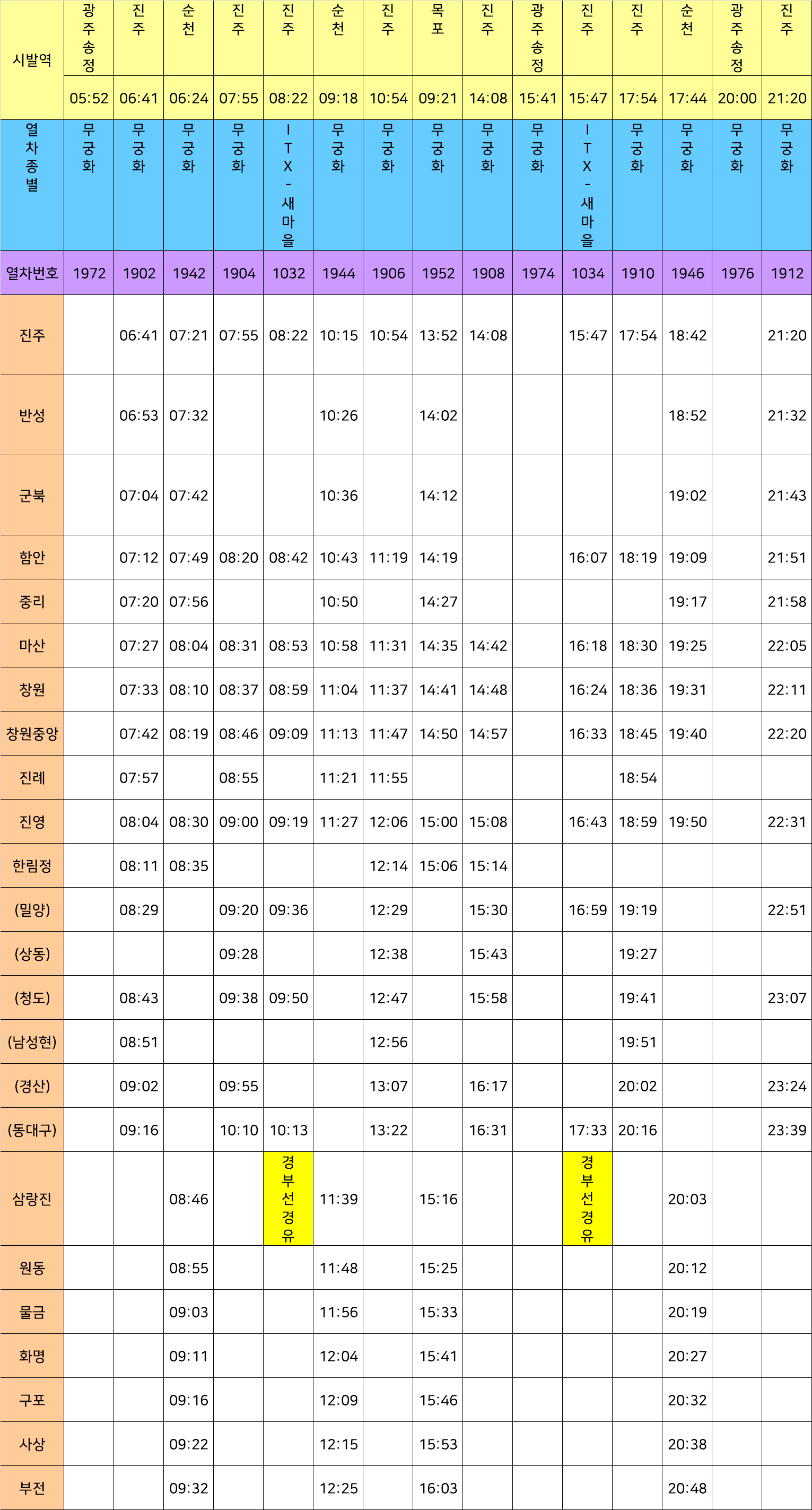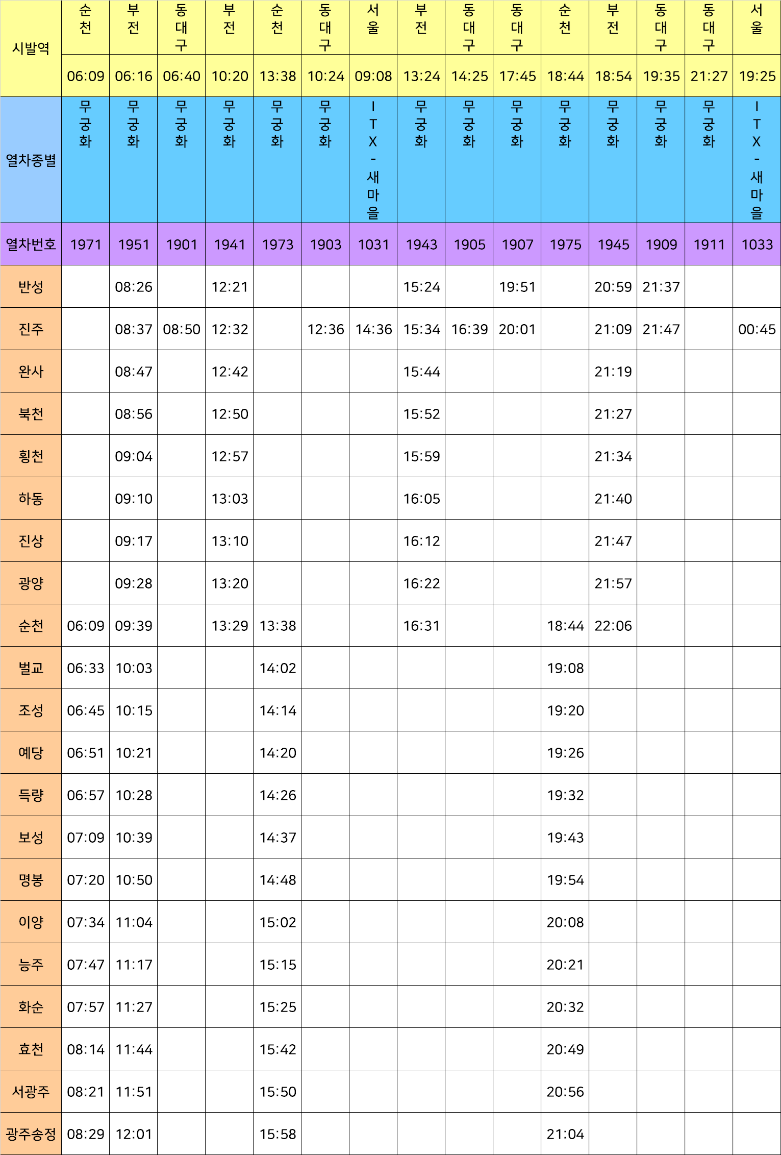 광주방향 기차 시간표