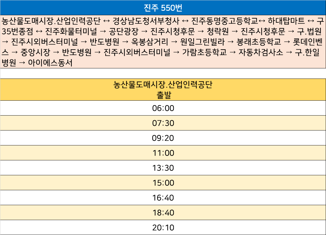 진주 550번: 농산물도매시장.산업인력공단 ↔ 경상남도청서부청사 ↔ 진주동명중고등학교↔ 하대탑마트 ↔ 구35번종점 ↔ 진주화물터미널 → 공단광장 → 진주시청후문 → 청락원 → 진주시청후문 → 구.법원 → 진주시외버스터미널 → 반도병원 → 옥봉삼거리 → 원일그린빌라 → 봉래초등학교 → 롯데인벤스 → 중앙시장 → 반도병원 → 진주시외버스터미널 → 가람초등학교 → 자동차검사소 → 구.한일병원 → 아이에스동서