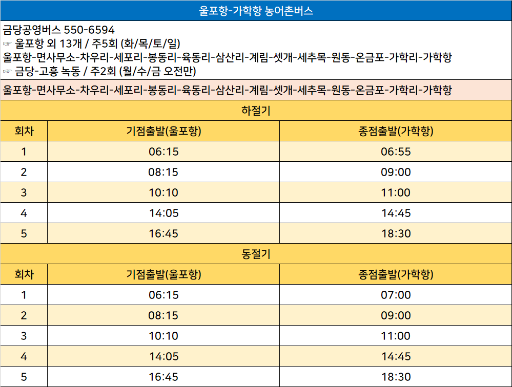 ●울포항-가학항 농어촌버스 노선정보: 울포항-면사무소-차우리-세포리-봉동리-육동리-삼산리-계림-셋개-세추목-원동-온금포-가학리-가학항
