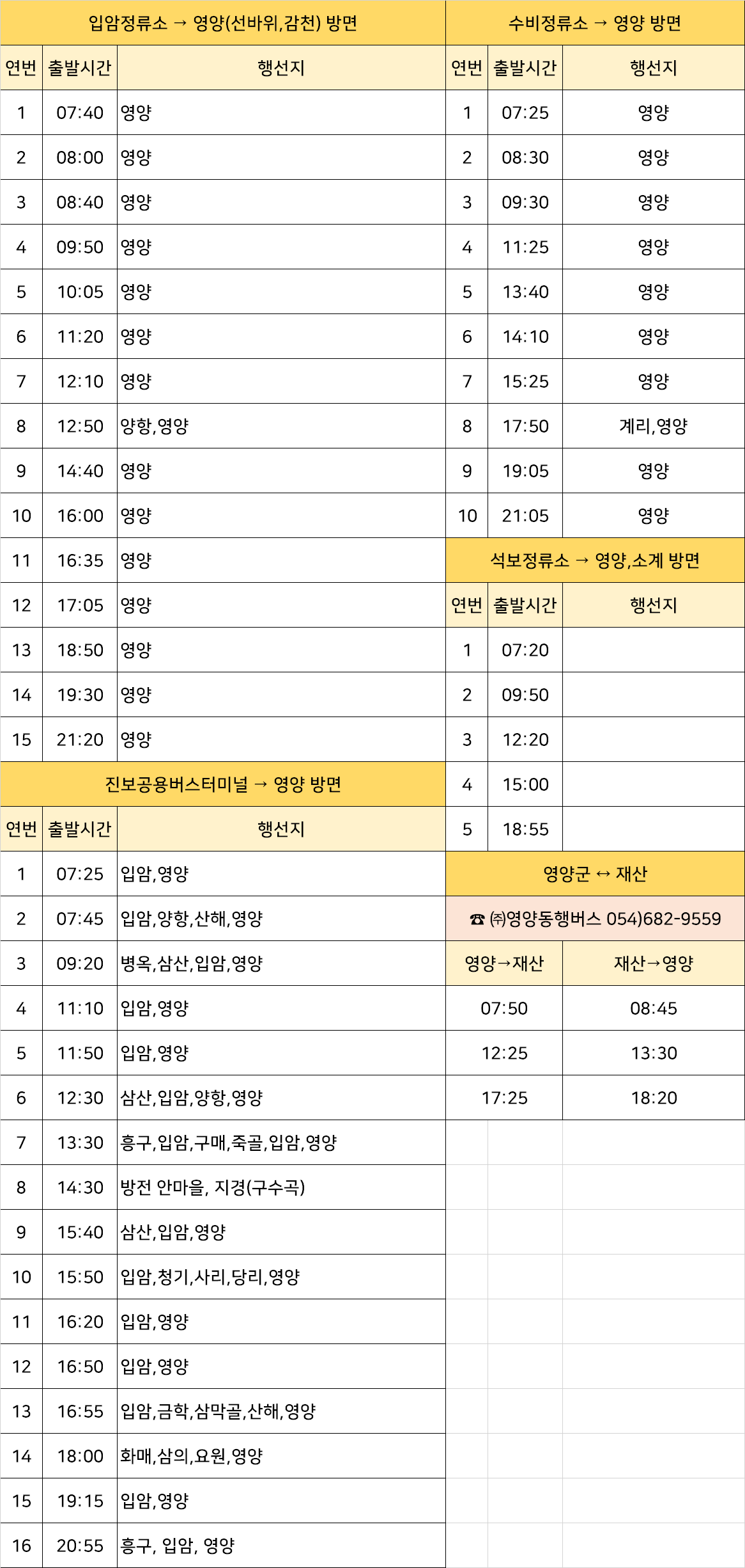 암정류소 → 영양(선바위,감천) 방면,수비정류소 → 영양 방면,석보정류소 → 영양,소계 방면, 진보공용버스터미널 → 영양 방면,영양군 ↔ 재산