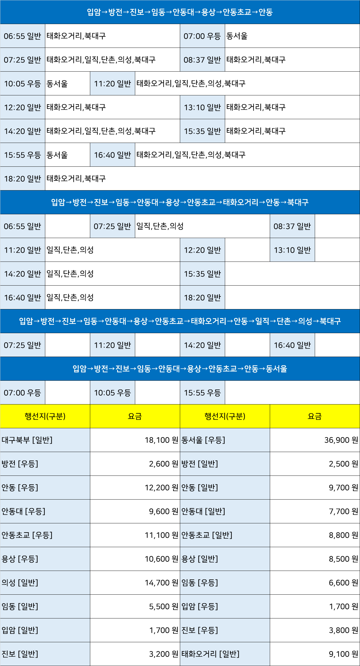 영양시외고속버스터미널 영양버스정류장 영양버스정류소 → "입암→방전→진보→임동→안동대→용상→안동초교→안동→동서울,입암→방전→진보→임동→안동대→용상→안동초교→태화오거리→안동→북대구,입암→방전→진보→임동→안동대→용상→안동초교→태화오거리→안동→일직→단촌→의성→북대구".