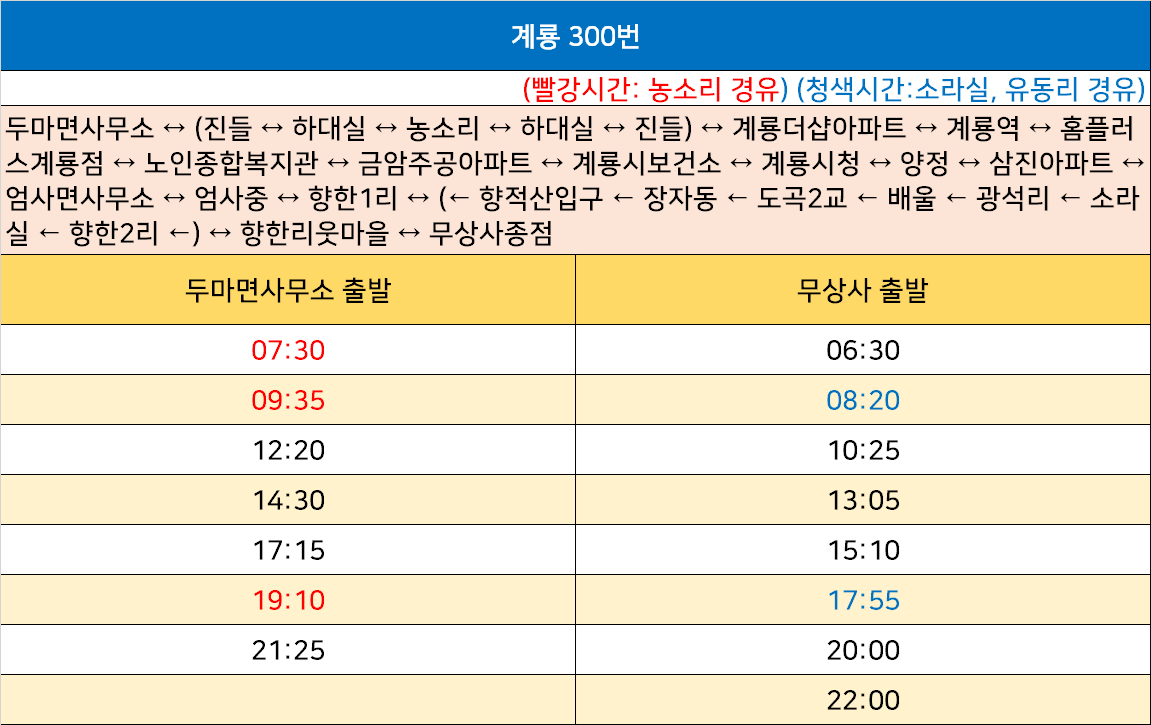 계룡 300번: 두마면사무소 ↔ (진들 ↔ 하대실 ↔ 농소리 ↔ 하대실 ↔ 진들) ↔ 계룡더샵아파트 ↔ 계룡역 ↔ 홈플러스계룡점 ↔ 노인종합복지관 ↔ 금암주공아파트 ↔ 계룡시보건소 ↔ 계룡시청 ↔ 양정 ↔ 삼진아파트 ↔ 엄사면사무소 ↔ 엄사중 ↔ 향한1리 ↔ (← 향적산입구 ← 장자동 ← 도곡2교 ← 배울 ← 광석리 ← 소라실 ← 향한2리 ←) ↔ 향한리웃마을 ↔ 무상사종점