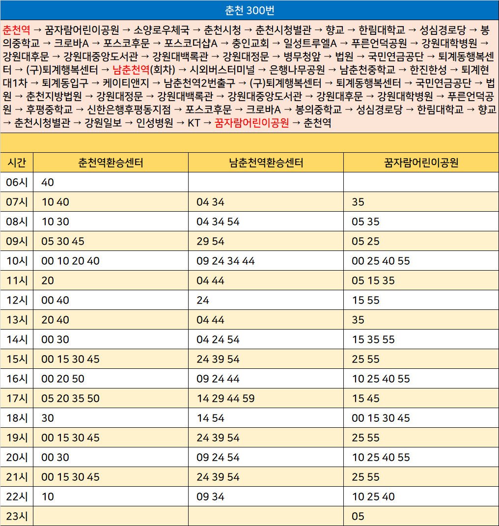 춘천 300번: 춘천역 → 꿈자람어린이공원 → 소양로우체국 → 춘천시청 → 춘천시청별관 → 향교 → 한림대학교 → 성심경로당 → 봉의중학교 → 크로바A → 포스코후문 → 포스코더샵A → 충인교회 → 일성트루엘A → 푸른언덕공원 → 강원대학병원 → 강원대후문 → 강원대중앙도서관 → 강원대백록관 → 강원대정문 → 병무청앞 → 법원 → 국민연금공단 → 퇴계동행복센터 → (구)퇴계행복센터 → 남춘천역(회차) → 시외버스터미널 → 은행나무공원 → 남춘천중학교 → 한진한성 → 퇴계현대1차 → 퇴계동입구 → 케이티앤지 → 남춘천역2번출구 → (구)퇴계행복센터 → 퇴계동행복센터 → 국민연금공단 → 법원 → 춘천지방법원 → 강원대정문 → 강원대백록관 → 강원대중앙도서관 → 강원대후문 → 강원대학병원 → 푸른언덕공원 → 후평중학교 → 신한은행후평동지점 → 포스코후문 → 크로바A → 봉의중학교 → 성심경로당 → 한림대학교 → 향교 → 춘천시청별관 → 강원일보 → 인성병원 → KT → 꿈자람어린이공원 → 춘천역