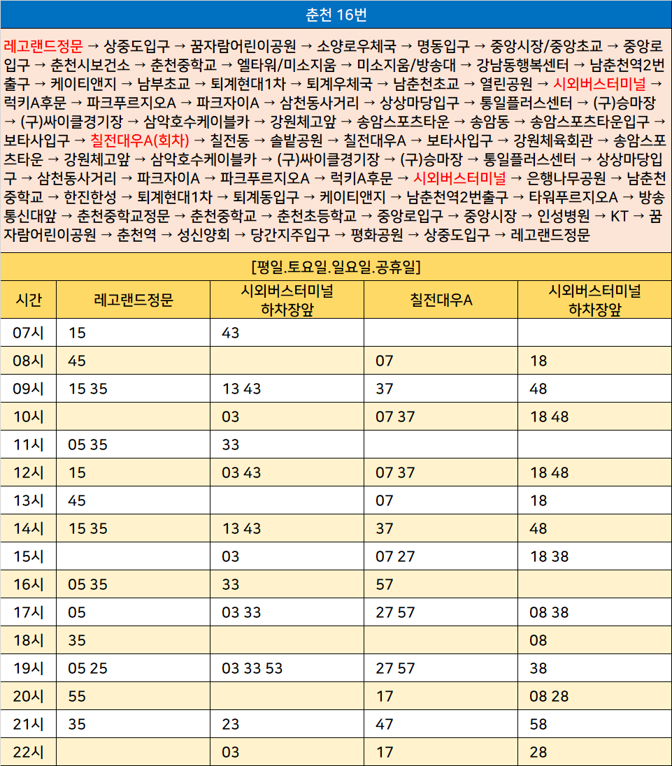 춘천 16번: 레고랜드정문 → 상중도입구 → 꿈자람어린이공원 → 소양로우체국 → 명동입구 → 중앙시장/중앙초교 → 중앙로입구 → 춘천시보건소 → 춘천중학교 → 엘타워/미소지움 → 미소지움/방송대 → 강남동행복센터 → 남춘천역2번출구 → 케이티앤지 → 남부초교 → 퇴계현대1차 → 퇴계우체국 → 남춘천초교 → 열린공원 → 시외버스터미널 → 럭키A후문 → 파크푸르지오A → 파크자이A → 삼천동사거리 → 상상마당입구 → 통일플러스센터 → (구)승마장 → (구)싸이클경기장 → 삼악호수케이블카 → 강원체고앞 → 송암스포츠타운 → 송암동 → 송암스포츠타운입구 → 보타사입구 → 칠전대우A(회차) → 칠전동 → 솔밭공원 → 칠전대우A → 보타사입구 → 강원체육회관 → 송암스포츠타운 → 강원체고앞 → 삼악호수케이블카 → (구)싸이클경기장 → (구)승마장 → 통일플러스센터 → 상상마당입구 → 삼천동사거리 → 파크자이A → 파크푸르지오A → 럭키A후문 → 시외버스터미널 → 은행나무공원 → 남춘천중학교 → 한진한성 → 퇴계현대1차 → 퇴계동입구 → 케이티앤지 → 남춘천역2번출구 → 타워푸르지오A → 방송통신대앞 → 춘천중학교정문 → 춘천중학교 → 춘천초등학교 → 중앙로입구 → 중앙시장 → 인성병원 → KT → 꿈자람어린이공원 → 춘천역 → 성신양회 → 당간지주입구 → 평화공원 → 상중도입구 → 레고랜드정문