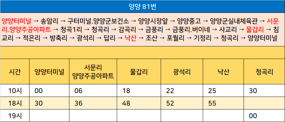 양양 81번: 양양터미널 → 송암리 → 구터미널.양양군보건소 → 양양시장앞 → 양양중고 → 양양군실내체육관 → 서문리.양양주공아파트 → 청곡1리 → 청곡리 → 감곡리 → 금풍리 → 금풍리.버이네 → 사교리 → 물갑리 → 침교리 → 적은리 → 방축리 → 광석리 → 답리 → 낙산 → 조산 → 포월리 → 기정리 → 청곡리 → 양양터미널