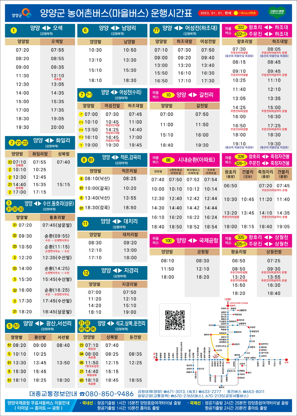 양양 11번: 양양터미널 ↔ 송암리 ↔ 구터미널.양양군보건소 ↔ 양양시장앞 ↔ 남문1리 ↔ 월리 ↔ 간리 ↔ 제궁말 ↔ 삼호아파트 ↔ 하왕도리 ↔ 상왕도리 ↔ 밀양리 ↔ 상양혈리 ↔ 하양혈리 ↔ 말곡리 ↔ 여운포리 ↔ 중광정리 ↔ 하조대 ↔ 하광정리 ↔ 중광정리 ↔ 상광정리 ↔ 대치리