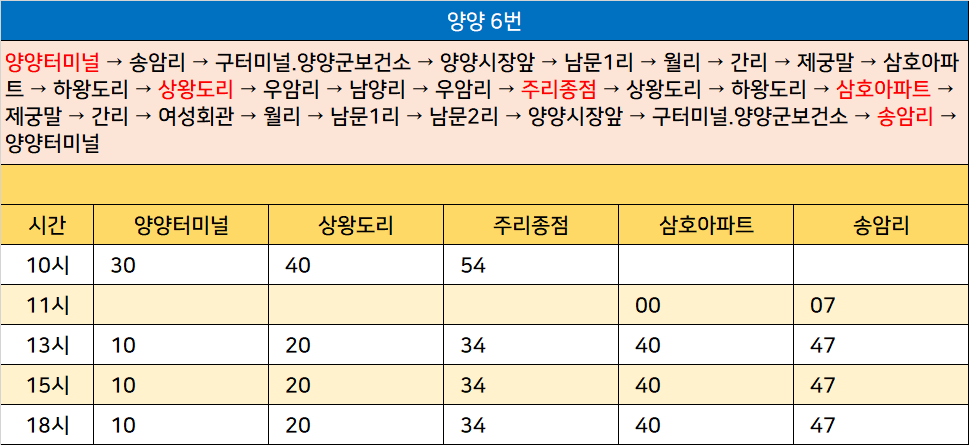 양양 6번: 양양터미널 → 송암리 → 구터미널.양양군보건소 → 양양시장앞 → 남문1리 → 월리 → 간리 → 제궁말 → 삼호아파트 → 하왕도리 → 상왕도리 → 우암리 → 남양리 → 우암리 → 주리종점 → 상왕도리 → 하왕도리 → 삼호아파트 → 제궁말 → 간리 → 여성회관 → 월리 → 남문1리 → 남문2리 → 양양시장앞 → 구터미널.양양군보건소 → 송암리 → 양양터미널