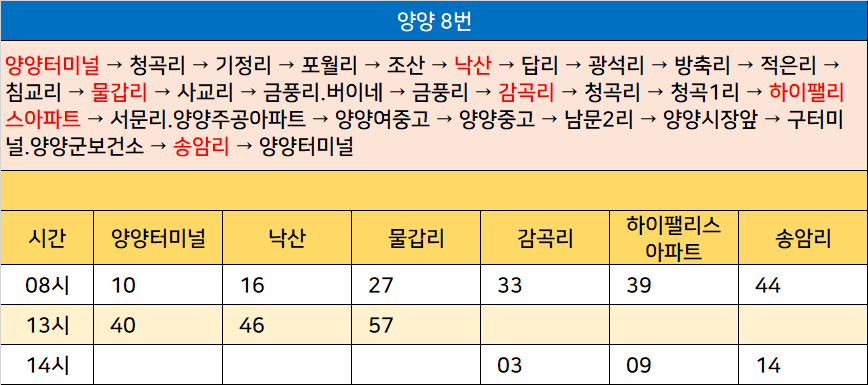 양양 8번: 양양터미널 → 청곡리 → 기정리 → 포월리 → 조산 → 낙산 → 답리 → 광석리 → 방축리 → 적은리 → 침교리 → 물갑리 → 사교리 → 금풍리.버이네 → 금풍리 → 감곡리 → 청곡리 → 청곡1리 → 하이팰리스아파트 → 서문리.양양주공아파트 → 양양여중고 → 양양중고 → 남문2리 → 양양시장앞 → 구터미널.양양군보건소 → 송암리 → 양양터미널