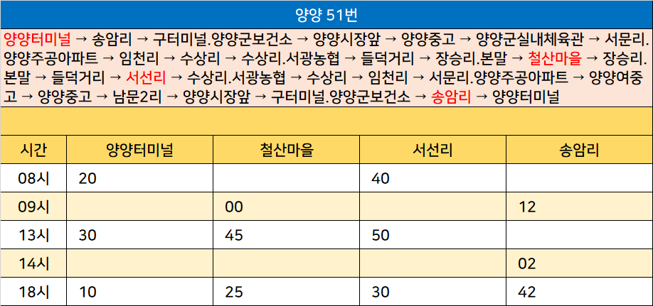 양양 51번: 양양터미널 → 송암리 → 구터미널.양양군보건소 → 양양시장앞 → 양양중고 → 양양군실내체육관 → 서문리.양양주공아파트 → 임천리 → 수상리 → 수상리.서광농협 → 들덕거리 → 장승리.본말 → 철산마을 → 장승리.본말 → 들덕거리 → 서선리 → 수상리.서광농협 → 수상리 → 임천리 → 서문리.양양주공아파트 → 양양여중고 → 양양중고 → 남문2리 → 양양시장앞 → 구터미널.양양군보건소 → 송암리 → 양양터미널