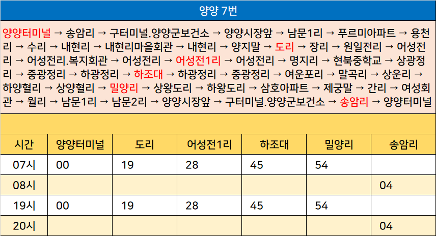양양 7번: 양양터미널 → 송암리 → 구터미널.양양군보건소 → 양양시장앞 → 남문1리 → 푸르미아파트 → 용천리 → 수리 → 내현리 → 내현리마을회관 → 내현리 → 양지말 → 도리 → 장리 → 원일전리 → 어성전리 → 어성전리.복지회관 → 어성전리 → 어성전1리 → 어성전리 → 명지리 → 현북중학교 → 상광정리 → 중광정리 → 하광정리 → 하조대 → 하광정리 → 중광정리 → 여운포리 → 말곡리 → 상운리 → 하양혈리 → 상양혈리 → 밀양리 → 상왕도리 → 하왕도리 → 삼호아파트 → 제궁말 → 간리 → 여성회관 → 월리 → 남문1리 → 남문2리 → 양양시장앞 → 구터미널.양양군보건소 → 송암리 → 양양터미널