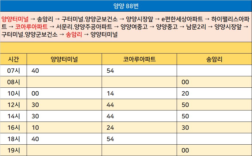 양양 88번: 양양터미널 → 송암리 → 구터미널.양양군보건소 → 양양시장앞 → e편한세상아파트 → 하이팰리스아파트 → 코아루아파트 → 서문리.양양주공아파트 → 양양여중고 → 양양중고 → 남문2리 → 양양시장앞 → 구터미널.양양군보건소 → 송암리 → 양양터미널