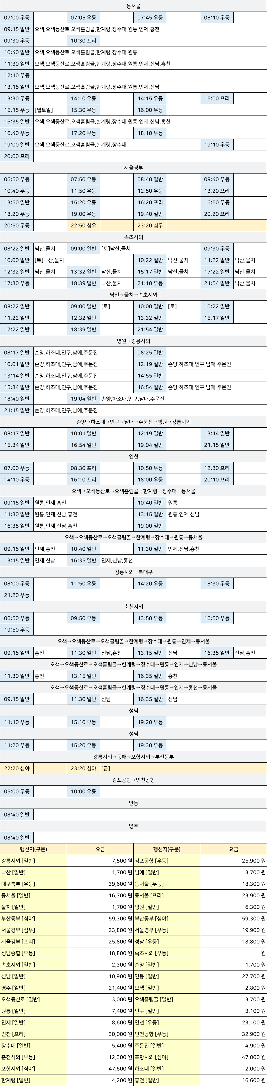 양양 시외버스 터미널 시간표/요금표 2025년 05월 13일 기준