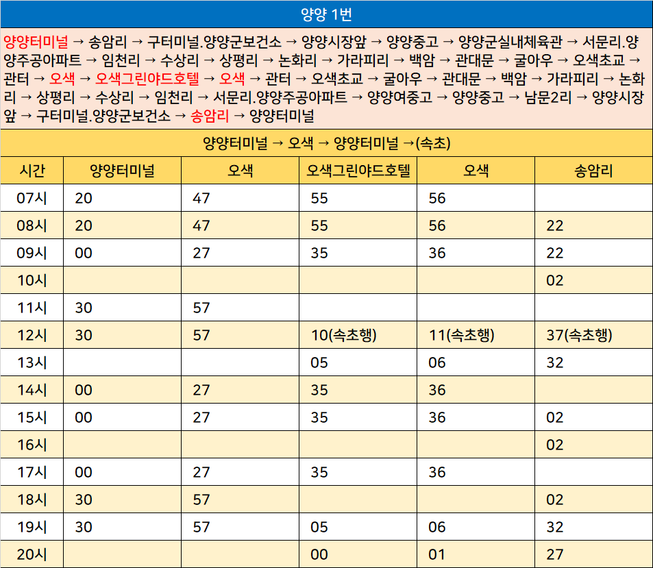 양양 1번: 양양터미널 → 송암리 → 구터미널.양양군보건소 → 양양시장앞 → 양양중고 → 양양군실내체육관 → 서문리.양양주공아파트 → 임천리 → 수상리 → 상평리 → 논화리 → 가라피리 → 백암 → 관대문 → 굴아우 → 오색초교 → 관터 → 오색 → 오색그린야드호텔 → 오색 → 관터 → 오색초교 → 굴아우 → 관대문 → 백암 → 가라피리 → 논화리 → 상평리 → 수상리 → 임천리 → 서문리.양양주공아파트 → 양양여중고 → 양양중고 → 남문2리 → 양양시장앞 → 구터미널.양양군보건소 → 송암리 → 양양터미널