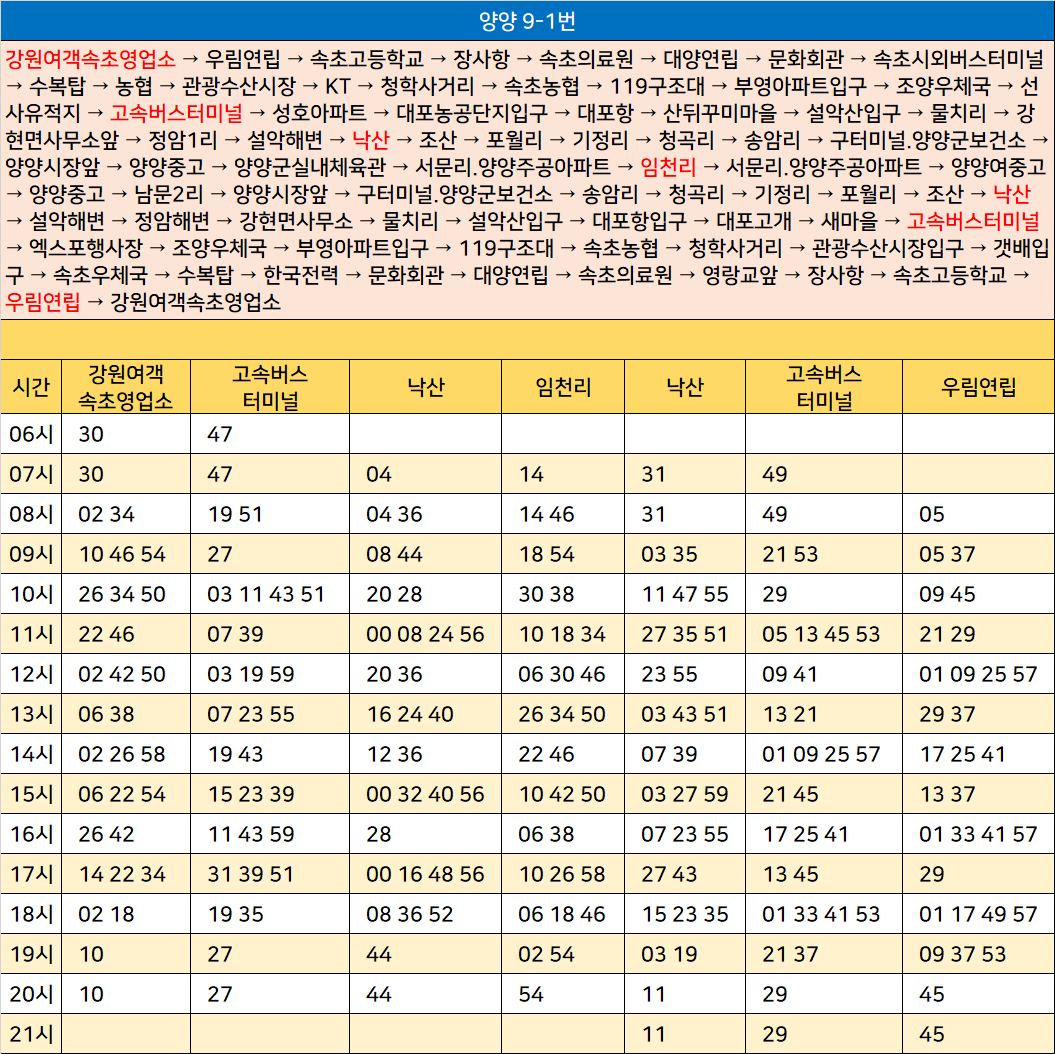 양양 9-1번: 강원여객속초영업소 → 우림연립 → 속초고등학교 → 장사항 → 속초의료원 → 대양연립 → 문화회관 → 속초시외버스터미널 → 수복탑 → 농협 → 관광수산시장 → KT → 청학사거리 → 속초농협 → 119구조대 → 부영아파트입구 → 조양우체국 → 선사유적지 → 고속버스터미널 → 성호아파트 → 대포농공단지입구 → 대포항 → 산뒤꾸미마을 → 설악산입구 → 물치리 → 강현면사무소앞 → 정암1리 → 설악해변 → 낙산 → 조산 → 포월리 → 기정리 → 청곡리 → 송암리 → 구터미널.양양군보건소 → 양양시장앞 → 양양중고 → 양양군실내체육관 → 서문리.양양주공아파트 → 임천리 → 서문리.양양주공아파트 → 양양여중고 → 양양중고 → 남문2리 → 양양시장앞 → 구터미널.양양군보건소 → 송암리 → 청곡리 → 기정리 → 포월리 → 조산 → 낙산 → 설악해변 → 정암해변 → 강현면사무소 → 물치리 → 설악산입구 → 대포항입구 → 대포고개 → 새마을 → 고속버스터미널 → 엑스포행사장 → 조양우체국 → 부영아파트입구 → 119구조대 → 속초농협 → 청학사거리 → 관광수산시장입구 → 갯배입구 → 속초우체국 → 수복탑 → 한국전력 → 문화회관 → 대양연립 → 속초의료원 → 영랑교앞 → 장사항 → 속초고등학교 → 우림연립 → 강원여객속초영업소