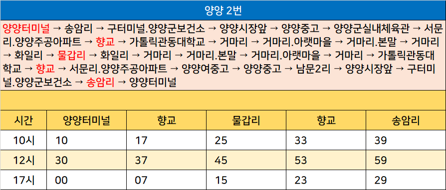 양양 2번: 양양터미널 → 송암리 → 구터미널.양양군보건소 → 양양시장앞 → 양양중고 → 양양군실내체육관 → 서문리.양양주공아파트 → 향교 → 가톨릭관동대학교 → 거마리 → 거마리.아랫마을 → 거마리.본말 → 거마리 → 화일리 → 물갑리 → 화일리 → 거마리 → 거마리.본말 → 거마리.아랫마을 → 거마리 → 가톨릭관동대학교 → 향교 → 서문리.양양주공아파트 → 양양여중고 → 양양중고 → 남문2리 → 양양시장앞 → 구터미널.양양군보건소 → 송암리 → 양양터미널