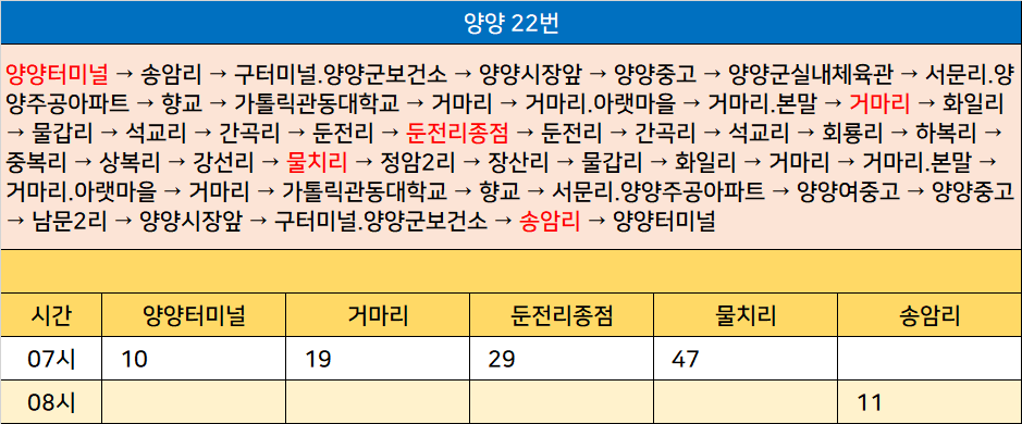 양양 22번: 양양터미널 → 송암리 → 구터미널.양양군보건소 → 양양시장앞 → 양양중고 → 양양군실내체육관 → 서문리.양양주공아파트 → 향교 → 가톨릭관동대학교 → 거마리 → 거마리.아랫마을 → 거마리.본말 → 거마리 → 화일리 → 물갑리 → 석교리 → 간곡리 → 둔전리 → 둔전리종점 → 둔전리 → 간곡리 → 석교리 → 회룡리 → 하복리 → 중복리 → 상복리 → 강선리 → 물치리 → 정암2리 → 장산리 → 물갑리 → 화일리 → 거마리 → 거마리.본말 → 거마리.아랫마을 → 거마리 → 가톨릭관동대학교 → 향교 → 서문리.양양주공아파트 → 양양여중고 → 양양중고 → 남문2리 → 양양시장앞 → 구터미널.양양군보건소 → 송암리 → 양양터미널