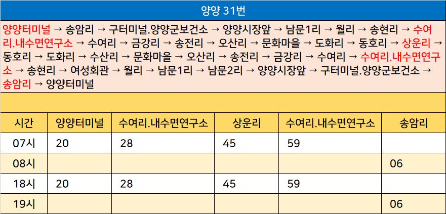 양양 31번: 양양터미널 → 송암리 → 구터미널.양양군보건소 → 양양시장앞 → 남문1리 → 월리 → 송현리 → 수여리.내수면연구소 → 수여리 → 금강리 → 송전리 → 오산리 → 문화마을 → 도화리 → 동호리 → 상운리 → 동호리 → 도화리 → 수산리 → 문화마을 → 오산리 → 송전리 → 금강리 → 수여리 → 수여리.내수면연구소 → 송현리 → 여성회관 → 월리 → 남문1리 → 남문2리 → 양양시장앞 → 구터미널.양양군보건소 → 송암리 → 양양터미널