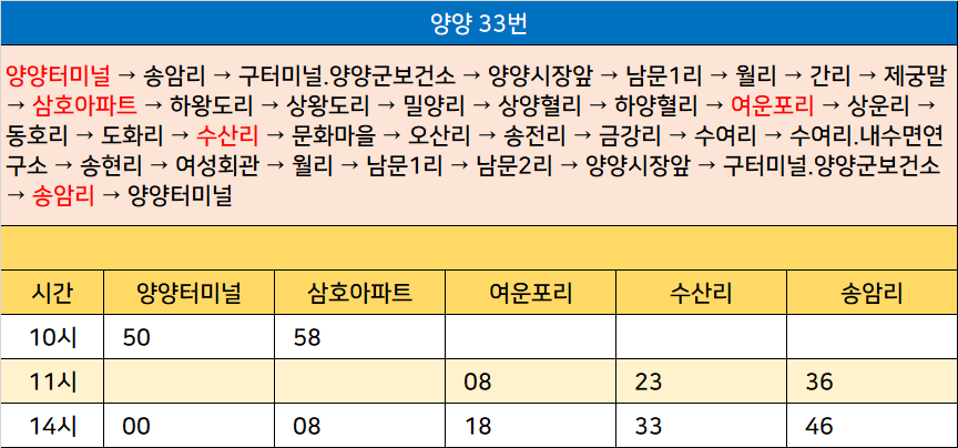 양양 33번: 양양터미널 → 송암리 → 구터미널.양양군보건소 → 양양시장앞 → 남문1리 → 월리 → 간리 → 제궁말 → 삼호아파트 → 하왕도리 → 상왕도리 → 밀양리 → 상양혈리 → 하양혈리 → 여운포리 → 상운리 → 동호리 → 도화리 → 수산리 → 문화마을 → 오산리 → 송전리 → 금강리 → 수여리 → 수여리.내수면연구소 → 송현리 → 여성회관 → 월리 → 남문1리 → 남문2리 → 양양시장앞 → 구터미널.양양군보건소 → 송암리 → 양양터미널