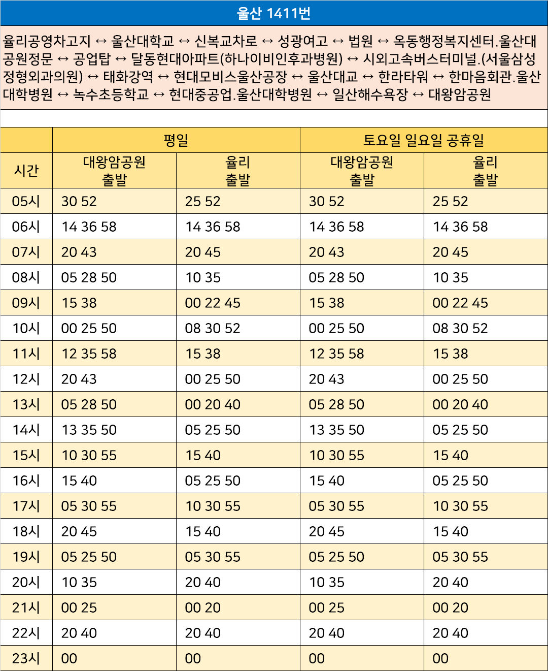 울산 1411번: 율리공영차고지 ↔ 울산대학교 ↔ 신복교차로 ↔ 성광여고 ↔ 법원 ↔ 옥동행정복지센터.울산대공원정문 ↔ 공업탑 ↔ 달동현대아파트(하나이비인후과병원) ↔ 시외고속버스터미널.(서울삼성정형외과의원) ↔ 태화강역 ↔ 현대모비스울산공장 ↔ 울산대교 ↔ 한라타워 ↔ 한마음회관.울산대학병원 ↔ 녹수초등학교 ↔ 현대중공업.울산대학병원 ↔ 일산해수욕장 ↔ 대왕암공원