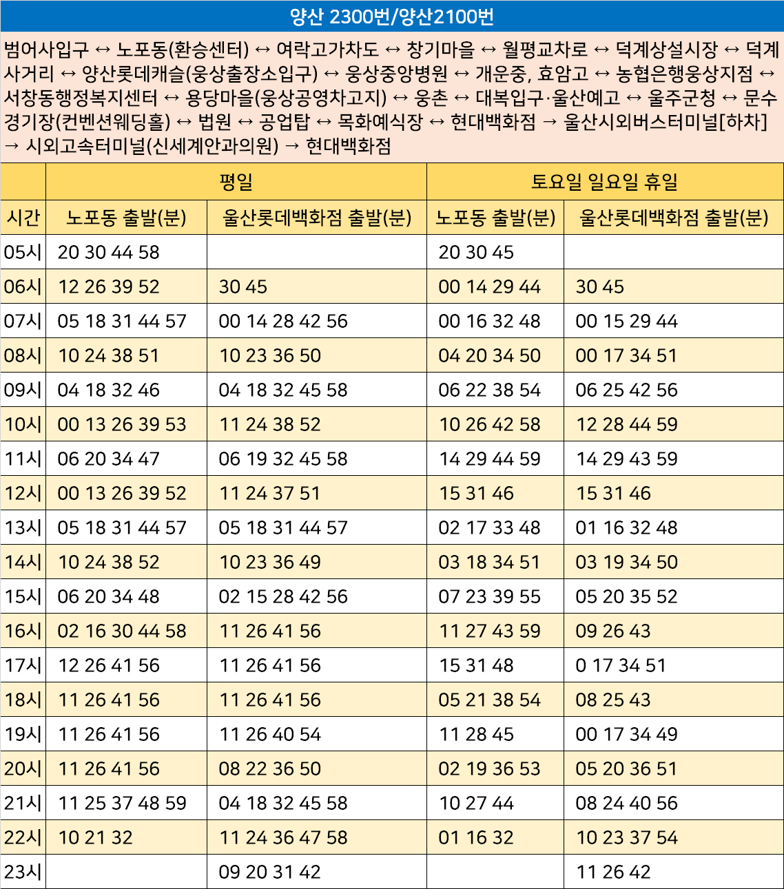 양산 2100번 2300번: 범어사입구 ↔ 노포동(환승센터) ↔ 여락고가차도 ↔ 창기마을 ↔ 월평교차로 ↔ 덕계상설시장 ↔ 덕계사거리 ↔ 양산롯데캐슬(웅상출장소입구) ↔ 웅상중앙병원 ↔ 개운중, 효암고 ↔ 농협은행웅상지점 ↔ 서창동행정복지센터 ↔ 용당마을(웅상공영차고지) ↔ 웅촌 ↔ 대복입구·울산예고 ↔ 울주군청 ↔ 문수경기장(컨벤션웨딩홀) ↔ 법원 ↔ 공업탑 ↔ 목화예식장 ↔ 현대백화점 → 울산시외버스터미널[하차] → 시외고속터미널(신세계안과의원) → 현대백화점