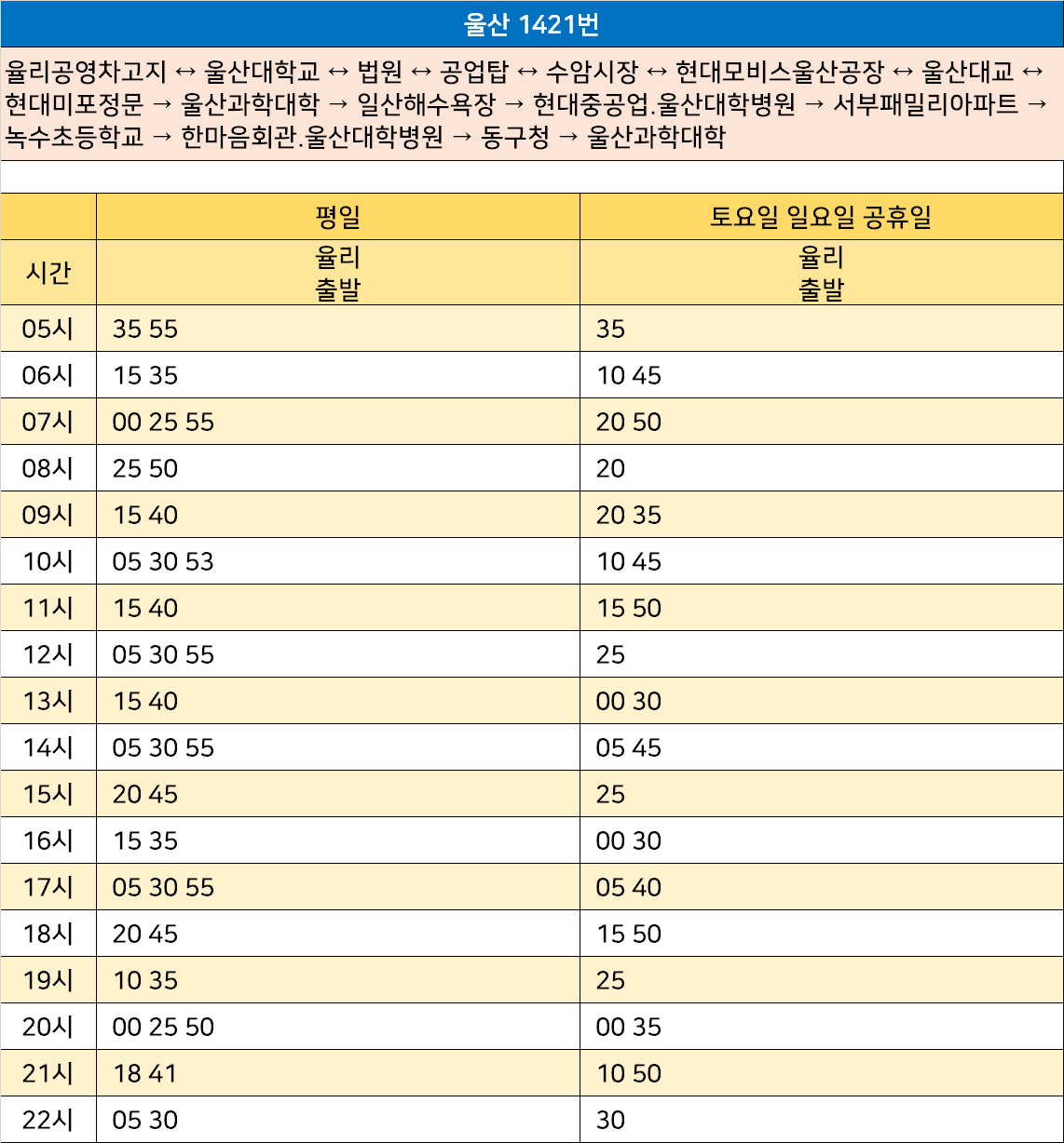울산 1421번: 율리공영차고지 ↔ 울산대학교 ↔ 법원 ↔ 공업탑 ↔ 수암시장 ↔ 현대모비스울산공장 ↔ 울산대교 ↔ 현대미포정문 → 울산과학대학 → 일산해수욕장 → 현대중공업.울산대학병원 → 서부패밀리아파트 → 녹수초등학교 → 한마음회관.울산대학병원 → 동구청 → 울산과학대학