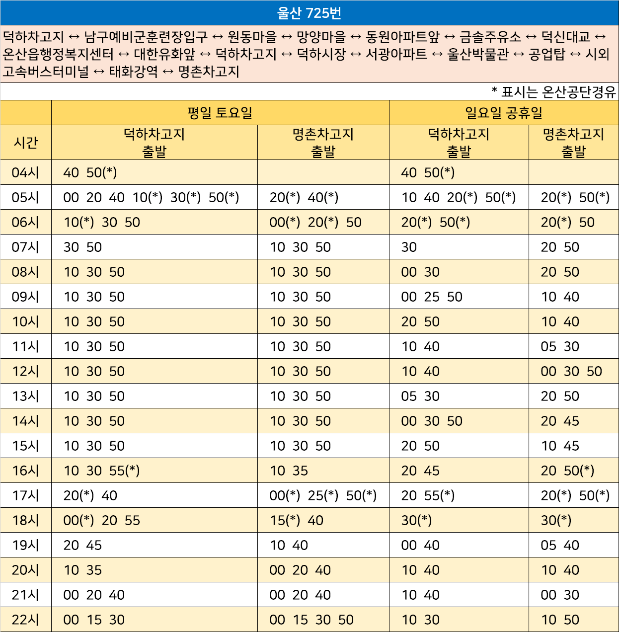 울산 725번: 덕하차고지 ↔ 남구예비군훈련장입구 ↔ 원동마을 ↔ 망양마을 ↔ 동원아파트앞 ↔ 금솔주유소 ↔ 덕신대교 ↔ 온산읍행정복지센터 ↔ 대한유화앞 ↔ 덕하차고지 ↔ 덕하시장 ↔ 서광아파트 ↔ 울산박물관 ↔ 공업탑 ↔ 시외고속버스터미널 ↔ 태화강역 ↔ 명촌