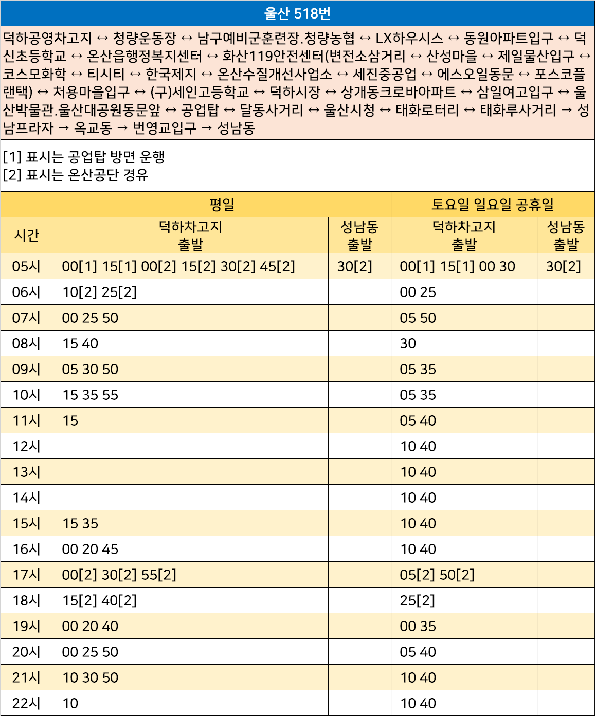 울산 518번: 덕하공영차고지 ↔ 청량운동장 ↔ 남구예비군훈련장.청량농협 ↔ LX하우시스 ↔ 동원아파트입구 ↔ 덕신초등학교 ↔ 온산읍행정복지센터 ↔ 화산119안전센터(변전소삼거리 ↔ 산성마을 ↔ 제일물산입구 ↔ 코스모화학 ↔ 티시티 ↔ 한국제지 ↔ 온산수질개선사업소 ↔ 세진중공업 ↔ 에스오일동문 ↔ 포스코플랜택) ↔ 처용마을입구 ↔ (구)세인고등학교 ↔ 덕하시장 ↔ 상개동크로바아파트 ↔ 삼일여고입구 ↔ 울산박물관.울산대공원동문앞 ↔ 공업탑 ↔ 달동사거리 ↔ 울산시청 ↔ 태화로터리 ↔ 태화루사거리 → 성남프라자 → 옥교동 → 번영교입구 → 성남동