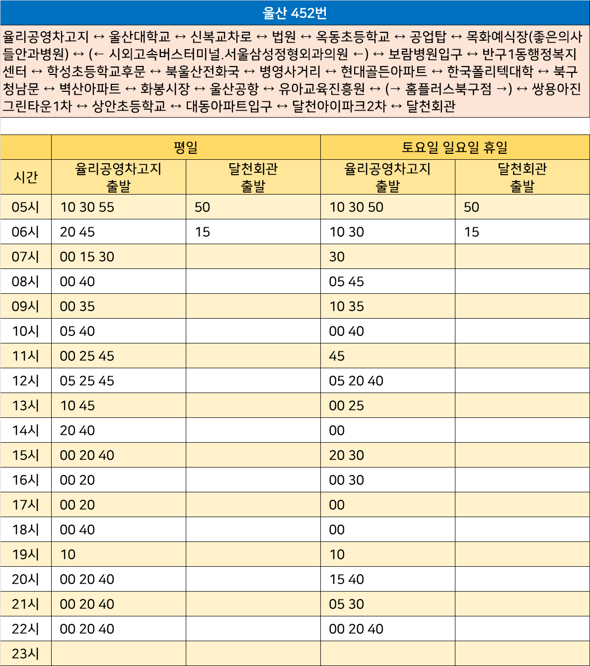 울산 452번: 율리공영차고지 ↔ 울산대학교 ↔ 신복교차로 ↔ 법원 ↔ 옥동초등학교 ↔ 공업탑 ↔ 목화예식장(좋은의사들안과병원) ↔ (← 시외고속버스터미널.서울삼성정형외과의원 ←) ↔ 보람병원입구 ↔ 반구1동행정복지센터 ↔ 학성초등학교후문 ↔ 북울산전화국 ↔ 병영사거리 ↔ 현대골든아파트 ↔ 한국폴리텍대학 ↔ 북구청남문 ↔ 벽산아파트 ↔ 화봉시장 ↔ 울산공항 ↔ 유아교육진흥원 ↔ (→ 홈플러스북구점 →) ↔ 쌍용아진그린타운1차 ↔ 상안초등학교 ↔ 대동아파트입구 ↔ 달천아이파크2차 ↔ 달천회관