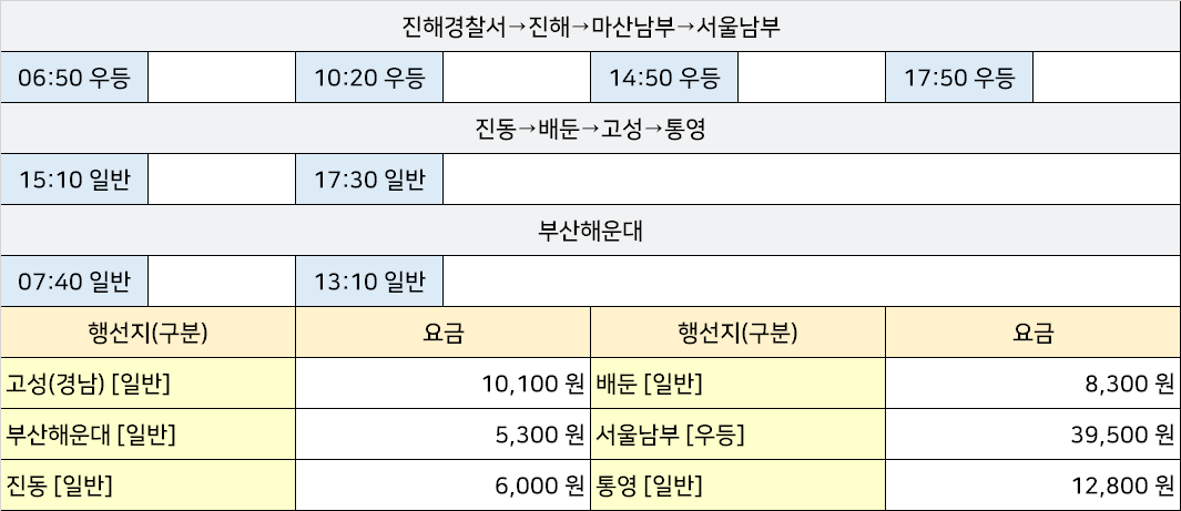 용원센터시외고속버스터미널 용원센터버스정류장 용원센터버스정류소 → "부산해운대,진동→배둔→고성→통영,진해경찰서→진해→마산남부→서울남부".