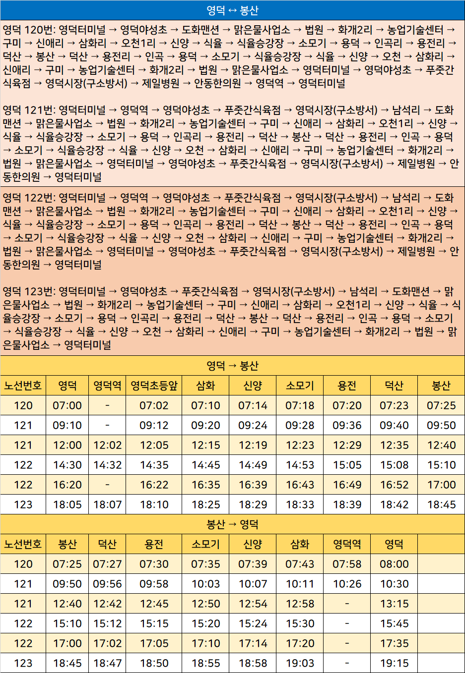 영덕↔봉산 노선정보: 영덕 120번, 영덕 121번, 영덕 122번, 영덕 123번