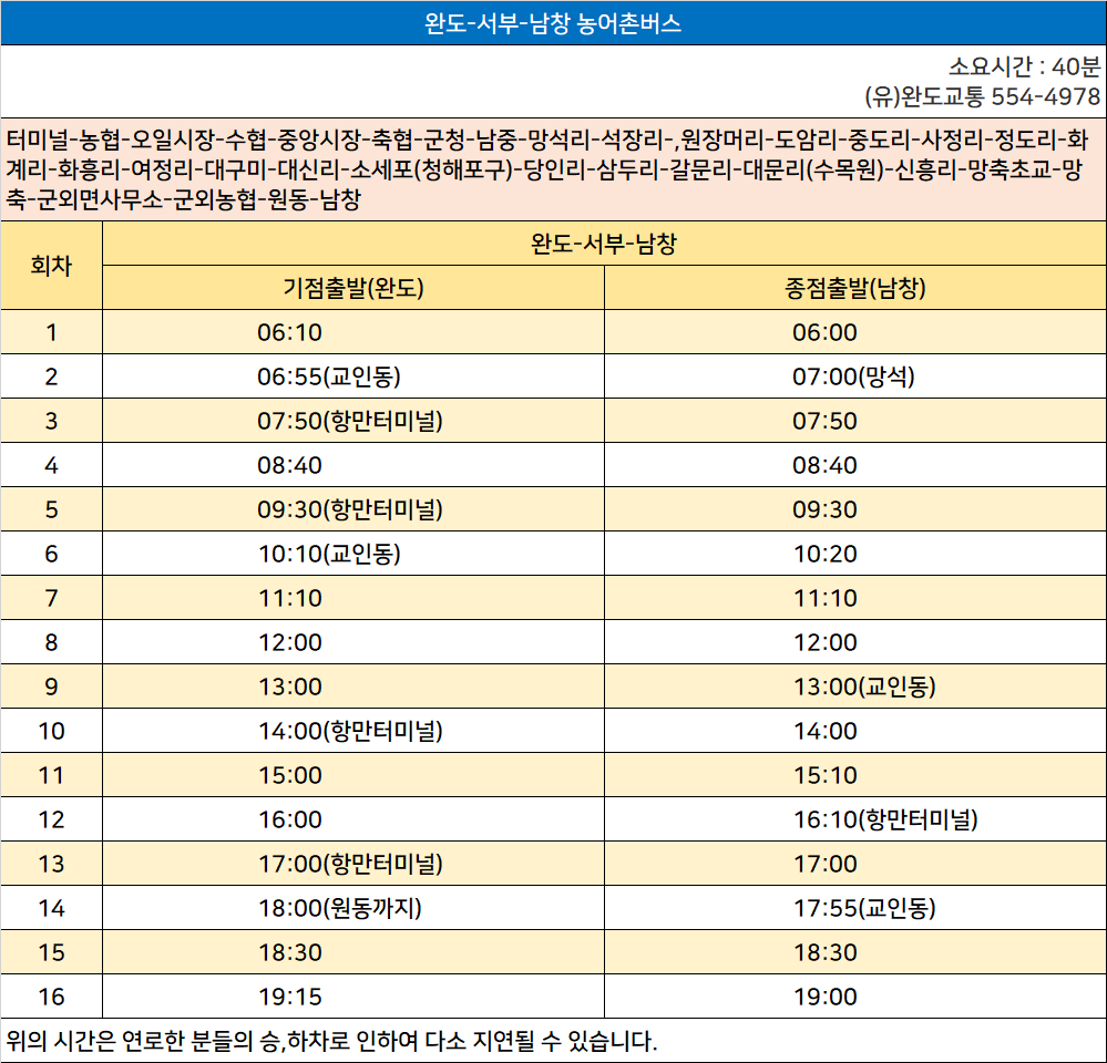 완도 ↔ 완도 수목원 순환 버스 시간표