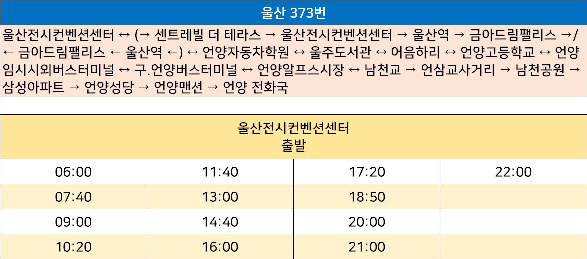 울산 373번: 울산전시컨벤션센터 ↔ (→ 센트레빌 더 테라스 → 울산전시컨벤션센터 → 울산역 → 금아드림팰리스 →/← 금아드림팰리스 ← 울산역 ←) ↔ 언양자동차학원 ↔ 울주도서관 ↔ 어음하리 ↔ 언양고등학교 ↔ 언양임시시외버스터미널 ↔ 구.언양버스터미널 ↔ 언양알프스시장 ↔ 남천교 → 언삼교사거리 → 남천공원 → 삼성아파트 → 언양성당 → 언양맨션 → 언양 전화국